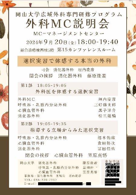 2024年9月20日に、主に医学科5年生を対象にした秋の岡山大学外科MC説明会を…